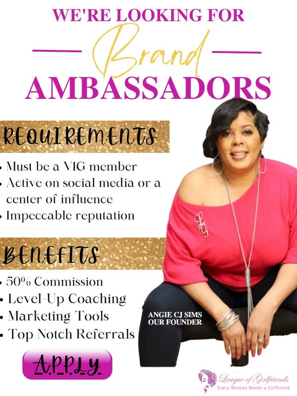 Our Ambassadors are our Champions and Cheer leaders for the League of Girlfriends. They assist us to grow the organization by selecting professional Women that they feel are VIG (Very Important Girlfriend) member material. She also shares all of the incredible things that we are doing to encourage them to join our tribe. We are looking for Ambassadors around the country. Each Ambassador must possess an incredible level of discernment to determine who to invite into our tribe.